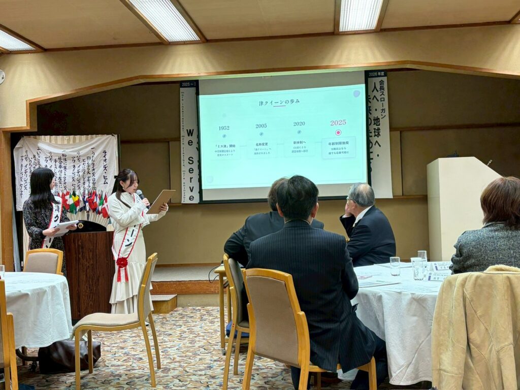 2025年度津クイーンの川口亜実様と2026年度津クイーンの森和枝様をお招きし、地域を盛り上げるご活動についてお話しいただきました。