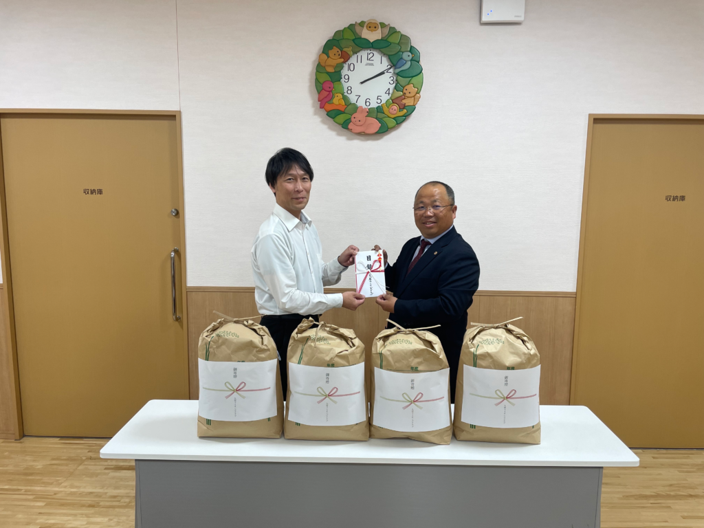 また、例会に先だってなないろ様に菅尾会長が訪問し、お米の寄付をさせていただきました。